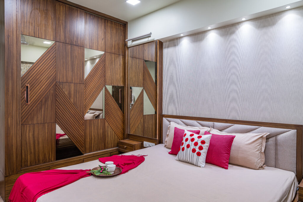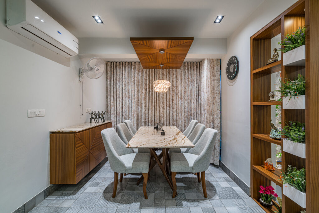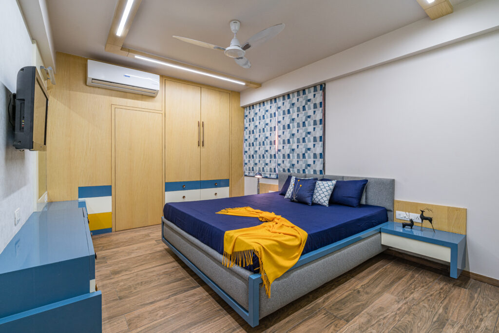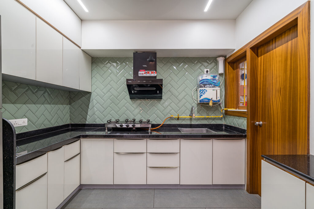 The interiors were crafted with a neutral color palette, accented by dark woods and grey flooring, creating a timeless and elegant feel. To add warmth, natural textures and handcrafted details were carefully layered. Each bedroom was given a distinct personality the master bedroom exudes sophistication with rich wood tones and geometric wardrobe patterns, while the children’s bedroom reflects energy and playfulness through a vibrant palette of blues and yellows. The kitchen was designed for efficiency with a U-shaped layout, seamless cabinetry, and a soothing green backsplash that adds freshness without overwhelming the space. Across the home, the thoughtful mix of materials, textures, and accents ensured a balance of functionality, comfort, and modern elegance.