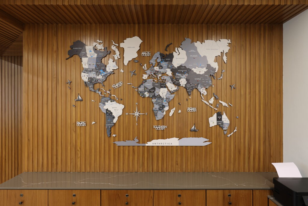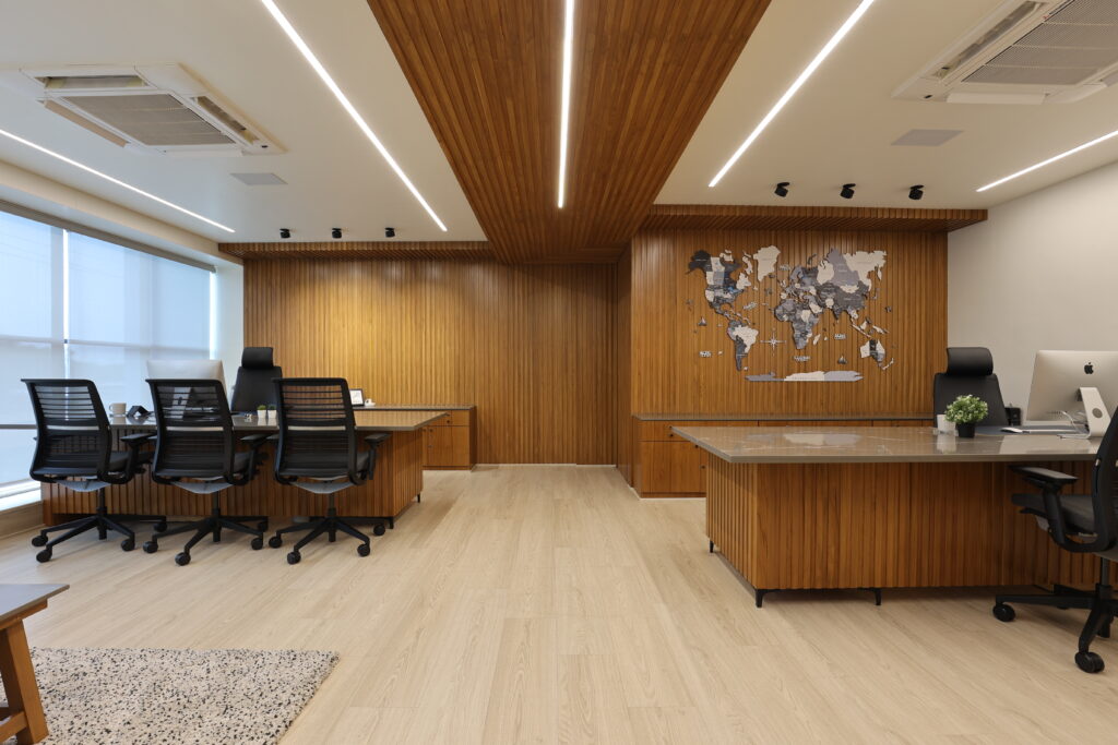 The cabin was conceptualized around the ideas of continuity, openness, and balance. Clean horizontal lines, large worktables, and warm wooden tones define the space, creating an atmosphere of authority and composure. A customizable world map installation adds a global perspective and becomes a visual highlight that reflects the company’s expanding presence. Hidden entries to service areas and restrooms maintain the seamless look, while careful spatial planning ensures efficiency, privacy, and comfort all aligned with vastu principles.