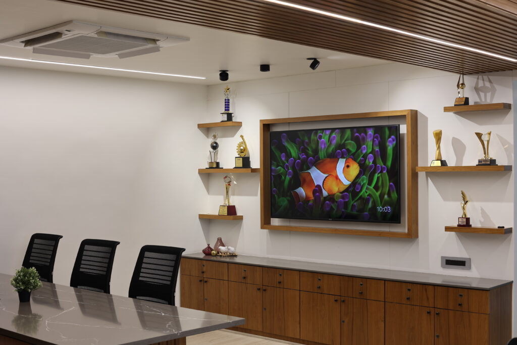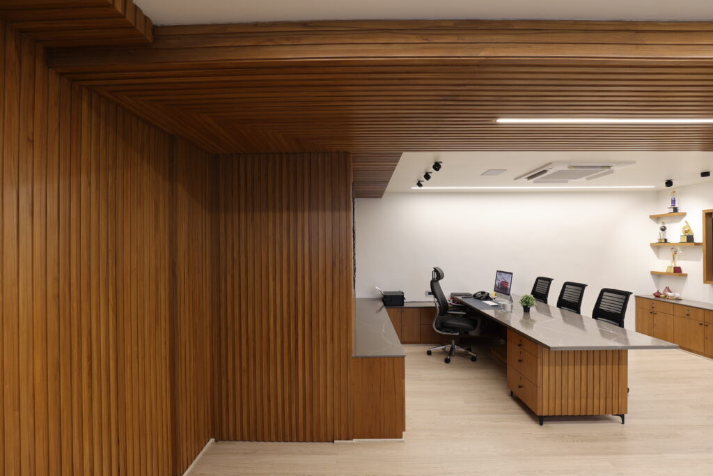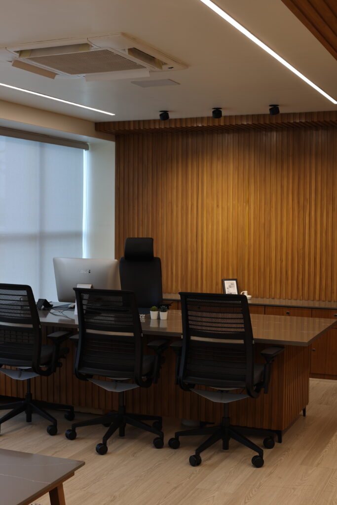 Executed with precision and minimal downtime, the project successfully delivered a sophisticated and functional executive cabin that resonates with calm, balance, and purpose. It stands as a reflection of efficient planning, timeless design, and subtle modernity an ideal workspace for leadership.