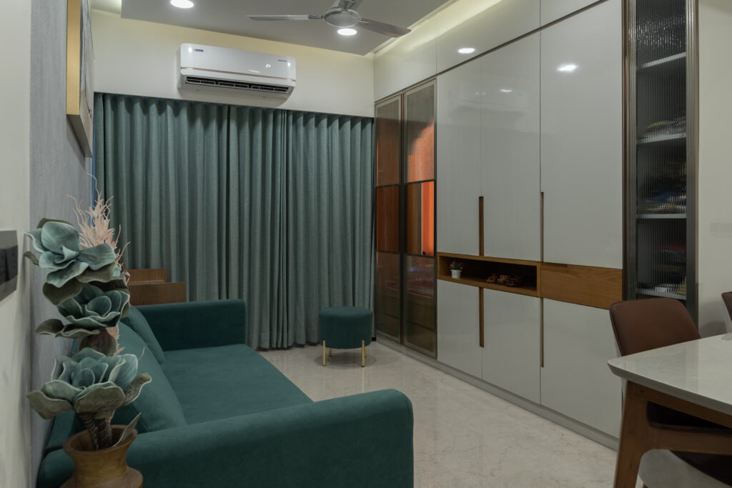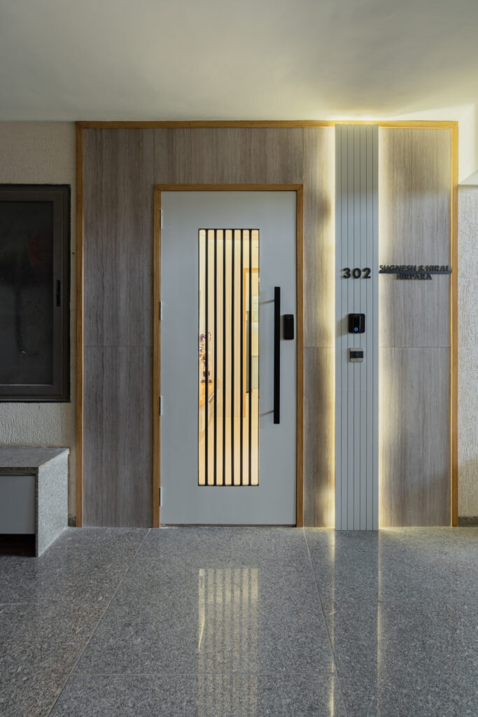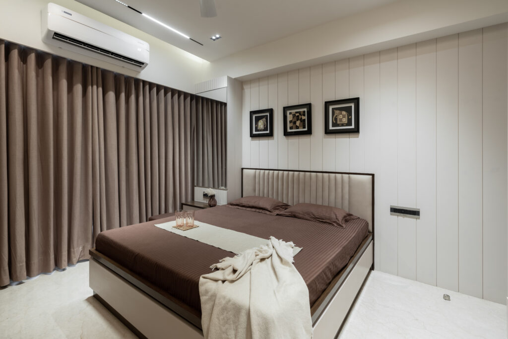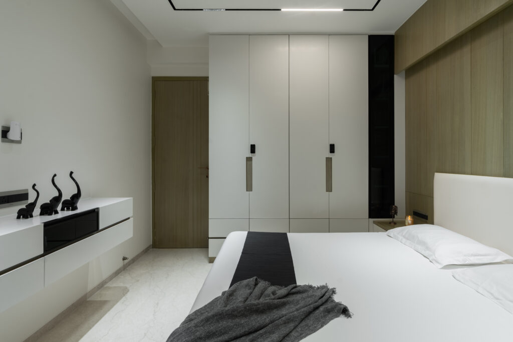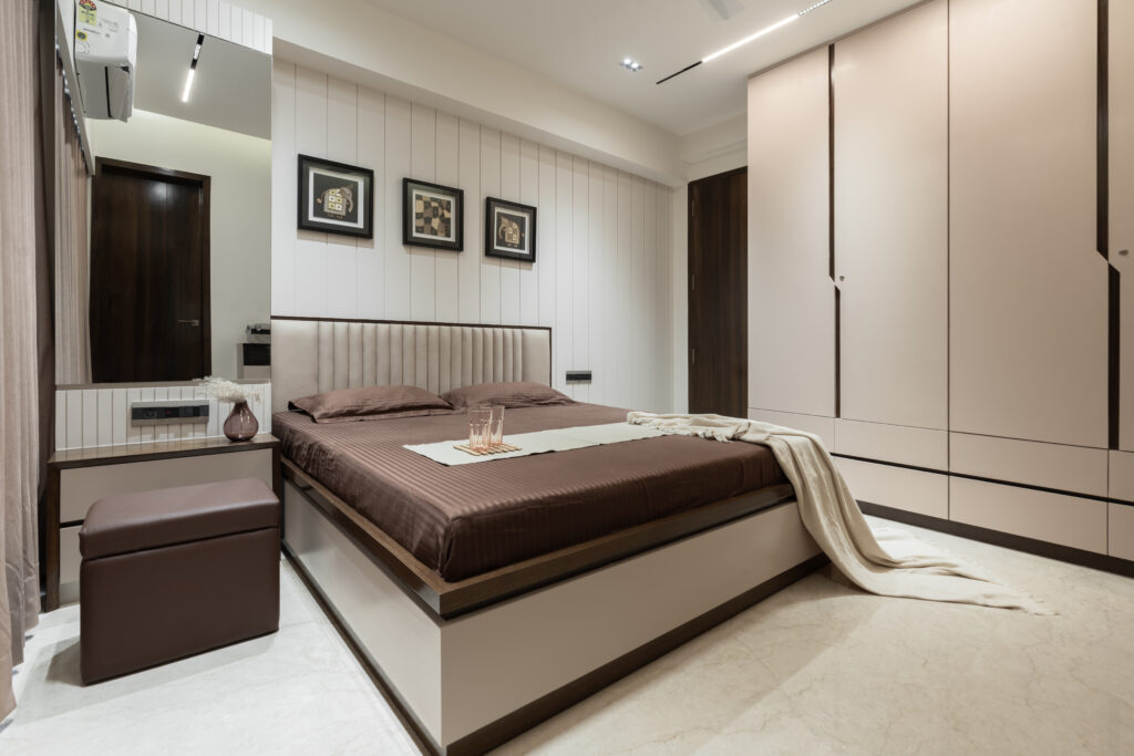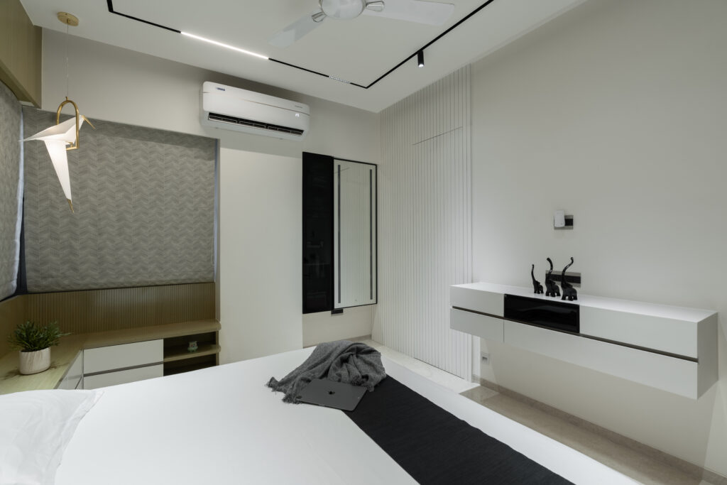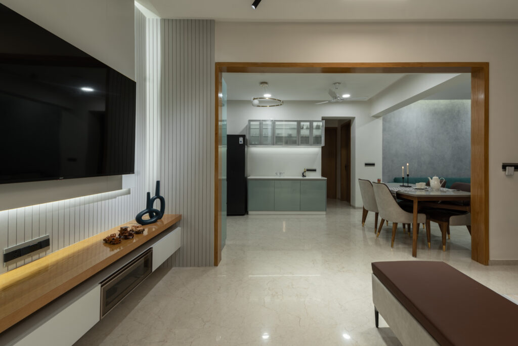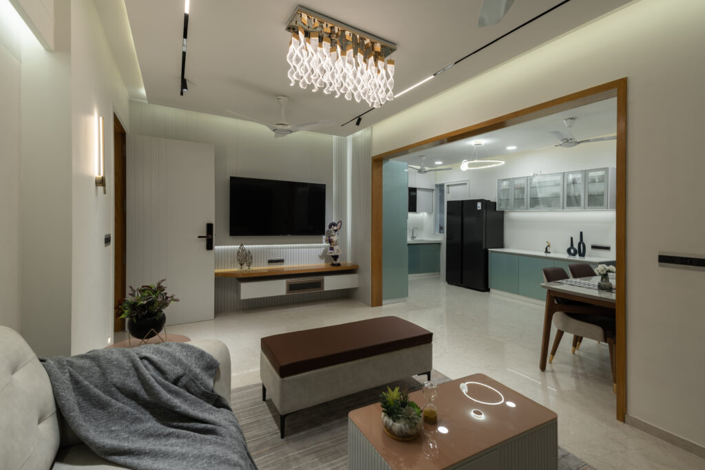 The core philosophy behind the design was “Less is More.” The approach focused on simplicity, proportion, and emotion creating a space that soothes the senses. The living and dining zones feature soft neutral shades and concealed lighting that add depth and calmness. Furniture was selected with an emphasis on sleek forms and functionality, using a mix of wooden textures and muted tones. Bedrooms were crafted to evoke coziness through warm finishes, layered fabrics, and minimal décor. Each element from the custom-designed doors with linear grooves to the accent partitions was thoughtfully detailed to enhance the flow of the home. Lighting design played a key role, using warm LEDs and cove lighting to emphasize architectural highlights and create an inviting ambiance.
